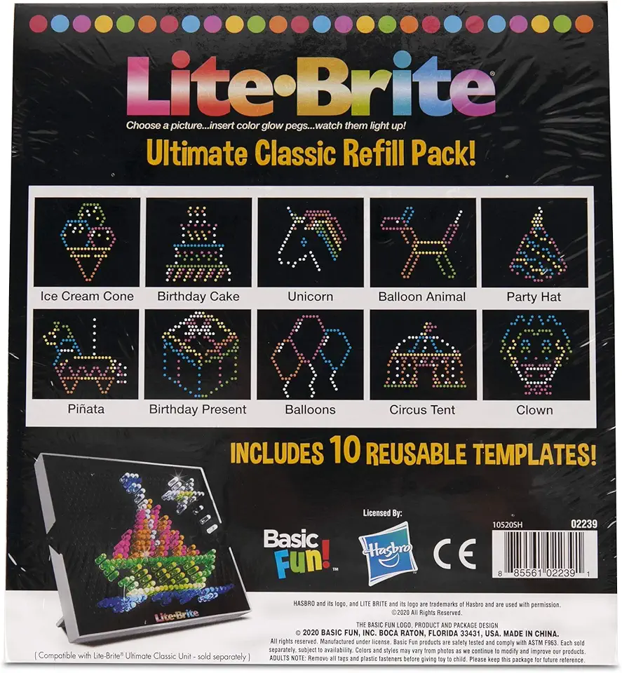 Products Lite-Brite Color Pop Rainbows Edition Lite Brite Color Pop Rainbows (multicolor, 3.5 lbs). Rainbow-themed glowing art. Creative fun for kids. Ages 4+. 1-year warranty. Shop Now Super Bright HD Pokémon Edition Lite Brite ITEM D5 Shop Now Ultimate Classic Refill Pack - Celebration Theme Lite Brite Ultimate Refill Pack Celebration (10 templates, 1 lb). Reusable designs for endless art. Amazon exclusive. 1-year warranty. Shop Now